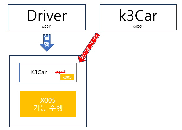 this.k3Car = k3Car; //즉 null에 x005를 대입한다.