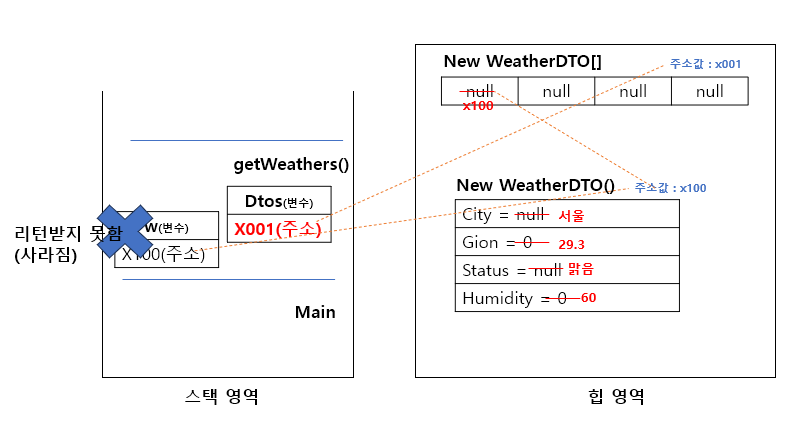 √ [문제 1]- 기존 배열에 값은 4개이다. 하지만 매개변수로 해당 값을 하나 찾아서 제거할 것이다. - 그러면 총 배열은 3개이다. - 배열은 동적인 요소이므로 숫자를 바꿀 수 없기 때문에 새로운 배열을 생성해준다. - 삭제한 배열 외 모든 값을 새로운 배열로 옮긴다. - removeWeather메서드를 완성해주세요public WeatherDTO[] removeWeather(WeatherDTO[] ar) {} [코드 완성 예시]더보기public WeatherDTO[] removeWeather(WeatherDTO[] ar) { WeatherDTO[] dtos = new WeatherDTO[ar.length - 1]; //하나 줄어들게 만들 것 //카피를 할 것 WeatherDTO fin..